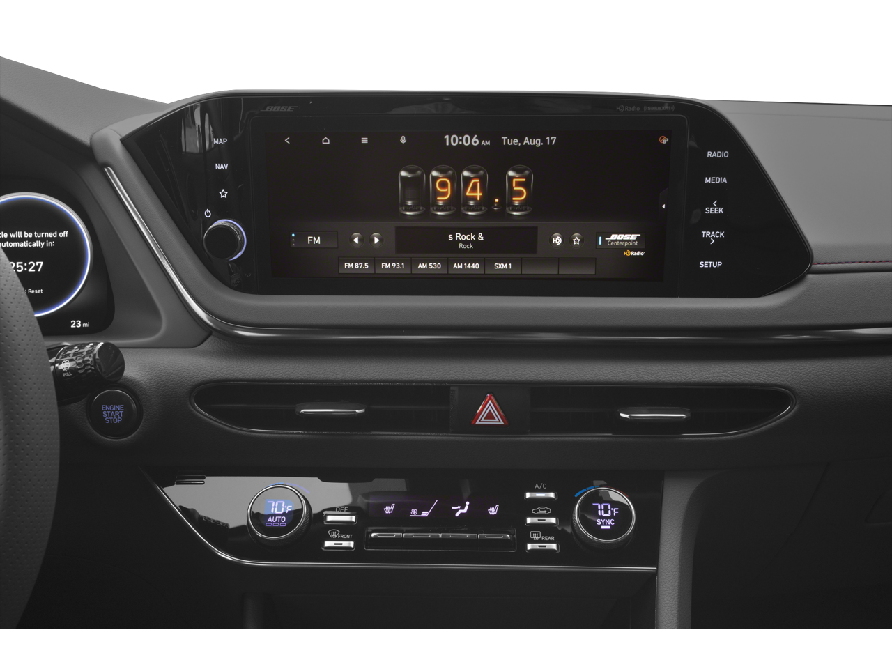 • Radio: AM/FM/MP3/HD/SiriusXM Display Audio w/Nav -inc: 10.25" color touchscreen, Bose premium audio w/12 speakers (1 center channel, 2 dash, 2 front tweeters, 4 door mounted, 2 rear mounted speakers plus 1 rear mounted subwoofer), dynamic voice recognition, integrated Bluetooth®, Blue Link connected car system, Apple CarPlay, Android Auto, USB, diversity antenna for navigation and HERE HD traffic